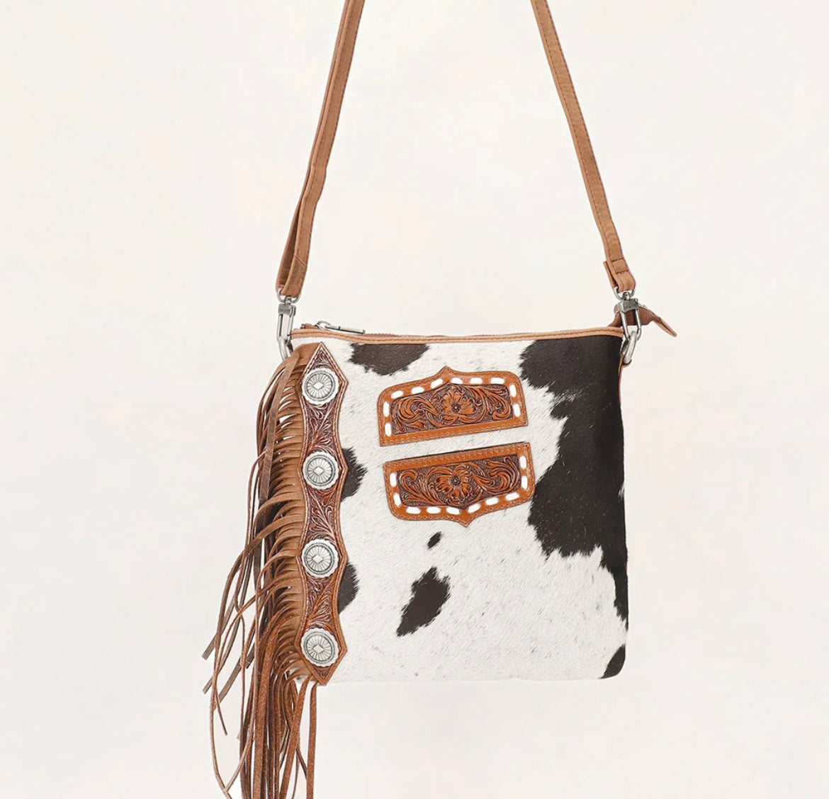 10.25x9.75 Please note: All cowhide is unique and the patterning on bags will vary! Colouring will be similar but the hide will be one of a kind!